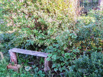 Tarka levelű fagyalbokrok védelmében rozoga, saját készítésű pad, mahónia, buxus, szellőrózsa társaságában
