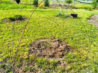 Itt igazából nem a rózsát mutatnám....:) bár az is ott van, a körbepermetezett kör közepén, őszi ültetéséhez képest egyébként nagyon ígéretesen, csak ebből a távolból látszik ilyen kicsinek. Szóval az esőben ilyen betonvasak leszúrásával szórakoztam... És igen, ez itt a Darlow Enigma, hibrid pézsma rózsa, ami igen termetes méretű lesz.